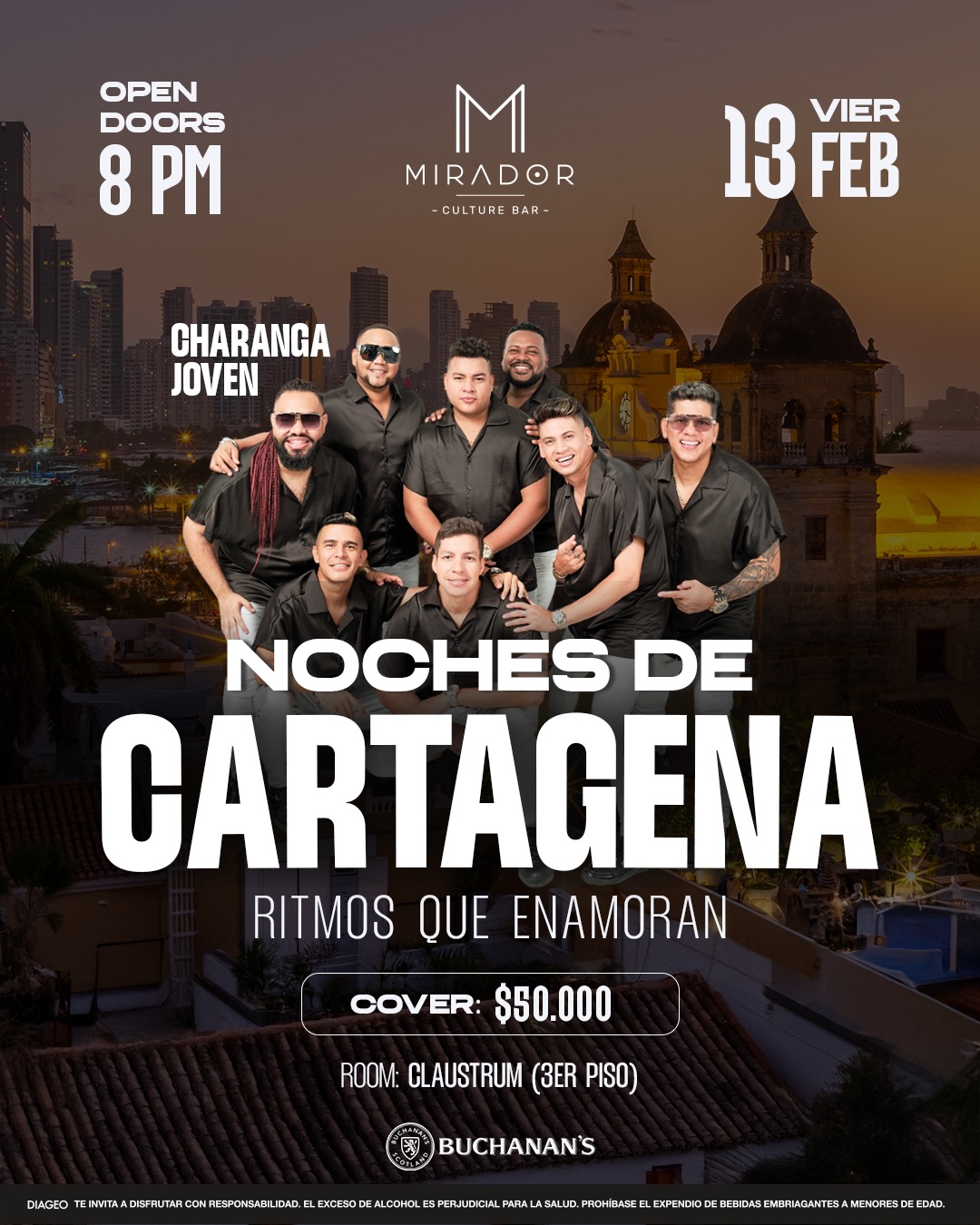 Este viernes 13 de febrero, Mirador Culture Bar abre sus puertas para una noche donde la música caribeña toma altura. Tendremos la presentación especial de Charanga Joven, interpretando los sonidos que definen nuestra esencia. 🕗 Open doors: 8:00 p.m. 🎟️ Cover: $50.000 Una cita con la música, la vista y el ambiente que solo Cartagena sabe ofrecer. 🍸 Book Now: +57 322 5109747 | +57 317 6435586