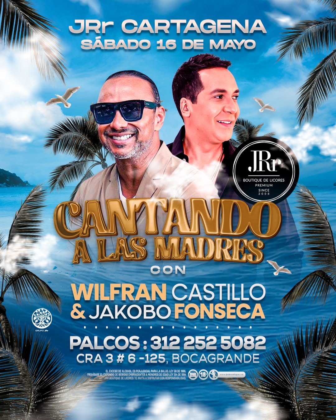 Mamá merece una noche inolvidable… 💫 En JRR Boutique de Licores Cartagena celebramos su mes con un íntimo espectacular junto a Wilfran Castillo y Jacobo Fonseca 🎶🥂 Cupos limitados… asegura el tuyo ahora 🎟️ 👉 Compra tus palcos y vive esta experiencia como se debe.