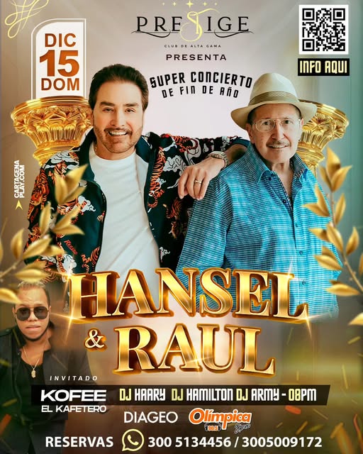 los músicos cubanos, dos leyendas que prometen una noche llena de energía, sabor y buena música. Con éxitos que han marcado generaciones y su inconfundible estilo, Hansel y Raúl pondrán a bailar a todo el público en un concierto diseñado para verdaderos amantes del género. Canciones como »